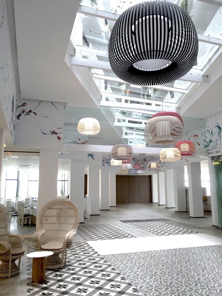 lámparas de iluminación Esteno de IDP Lampshades, en contraste con reminiscencias vintage como el suelo de mosaico del vestíbulo.